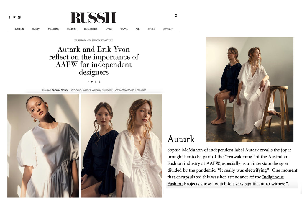 RUSSH Magazine, July 2021 https://www.russh.com/autark-erik-yvon-importance-of-aafw-for-independent-designers/